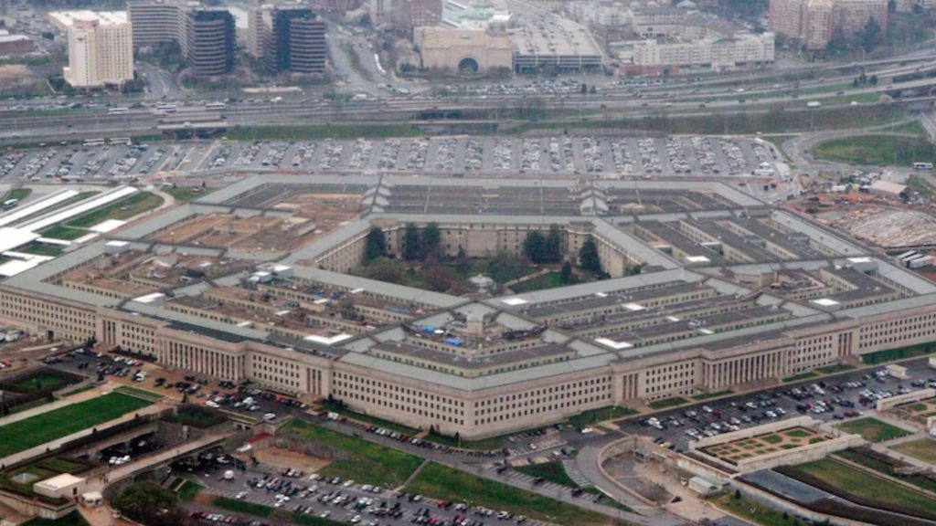 국방부의 항공 사진 – 주차장이 있는 대형 5면 사무실 건물